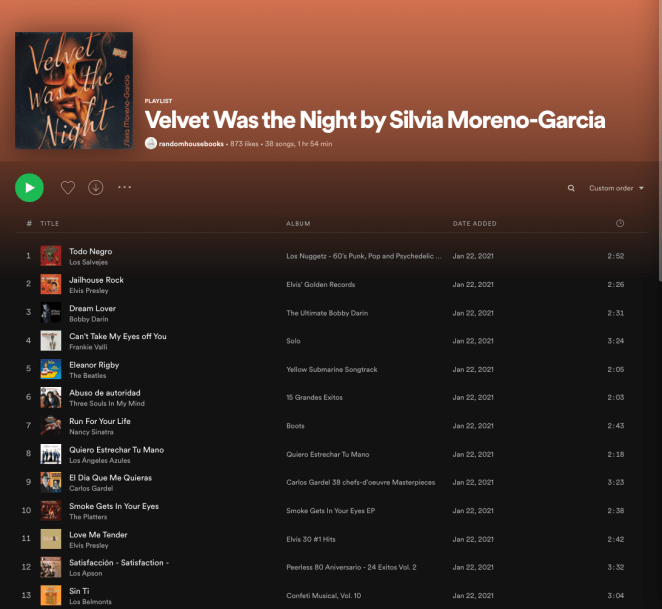 As I make my way through Silvia Moreno Garcia’s backlist, I will start ranking them in hopes of a dedication post for my favorite author. 𝑴𝒆𝒙𝒊𝒄𝒂𝒏 𝑮𝒐𝒕𝒉𝒊𝒄 still reigns in my heart as my favorite SMG, however I really enjoyed this book. Maite will NOT be everyone’s cup of tea but I personally enjoy unlikeable characters. This book is heavy on the events that took place in Mexico during the 60’s surrounding students & government. If you enjoy having a bit of Historical Fiction weaved throughout or in this case where it’s the back drop, then you’ll probably really enjoy this one. I felt the author nailed it when she described it as having a very Pulp Noir feel, I definitely got those vibes. We have a mystery at the core, political unrest in the background, two MC’s with a deep appreciation of older Rock N’ Roll and career criminals in the mix. Silvia Moreno-Garcia is known for her signature mark of blending multiple genres, Velvet was the Night is a mash up of Mystery Thriller and Historical Fiction. I have come to expect to be pleasantly surprised every time I pick up a SMG book because I know that it won’t have the same feel as any of her other books. It’s become a little thrilling in a sense to see what she has in store within the pages of the next book. If you enjoy music while you read, check out SMG’s Velvet Was the Night Playlist on Spotify!