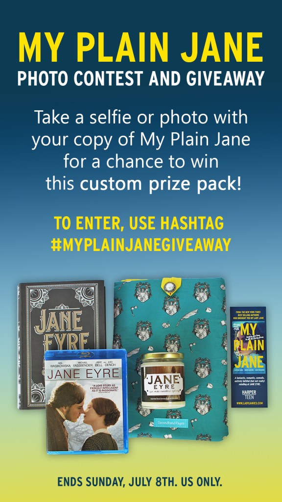 Share a photo or selfie with your copy of My Plain Jane and you could win a custom designed book sleeve, made by Second Hand Pages, a custom Jane Eyre candle from Canterbury Road Co, Jane Eyre (Barnes and Noble Collectible Edition), the Blu-Ray DVD of Jane Eyre, and a My Plain Jane Bookmark! For the photo, you can use your copy, a friends or one from the library. Use the hashtag #MyPlainJaneGiveaway to enter. Open to US only. Ends Sunday, July 8th.